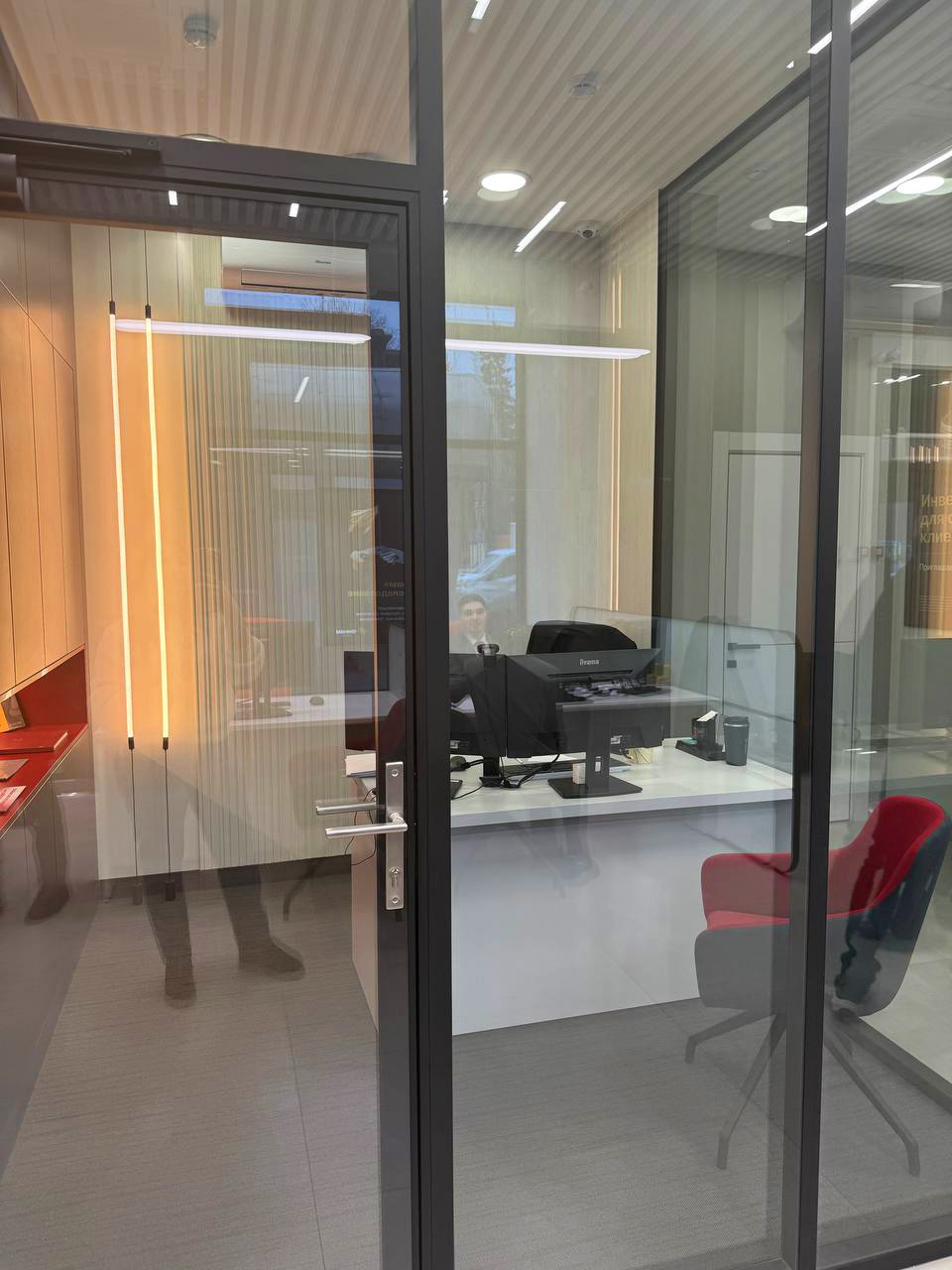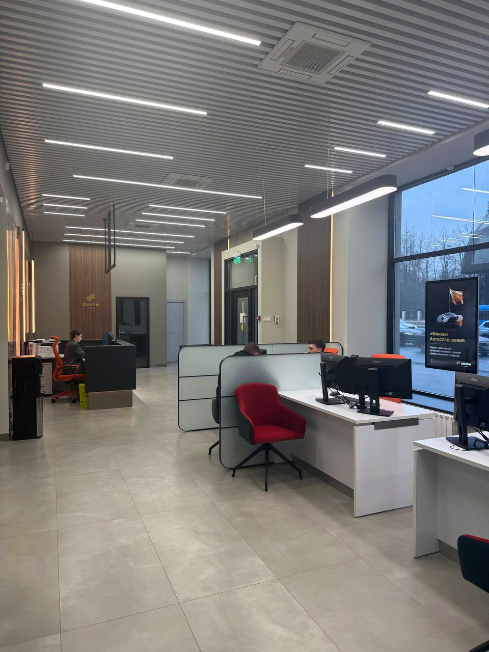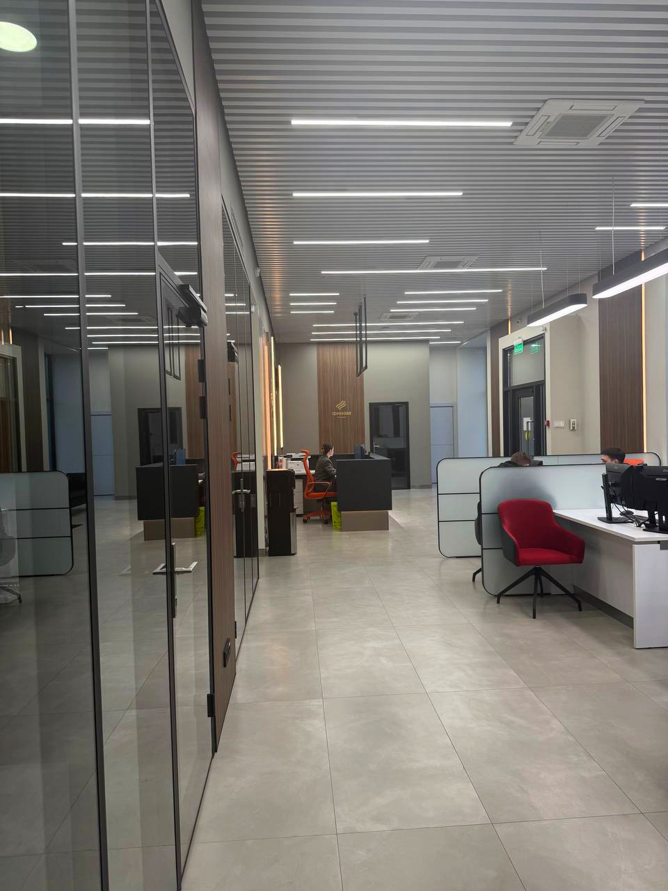 Современный офис банка с акцентом на комфорт клиентов, функциональность зон обслуживания и строгий деловой стиль.
