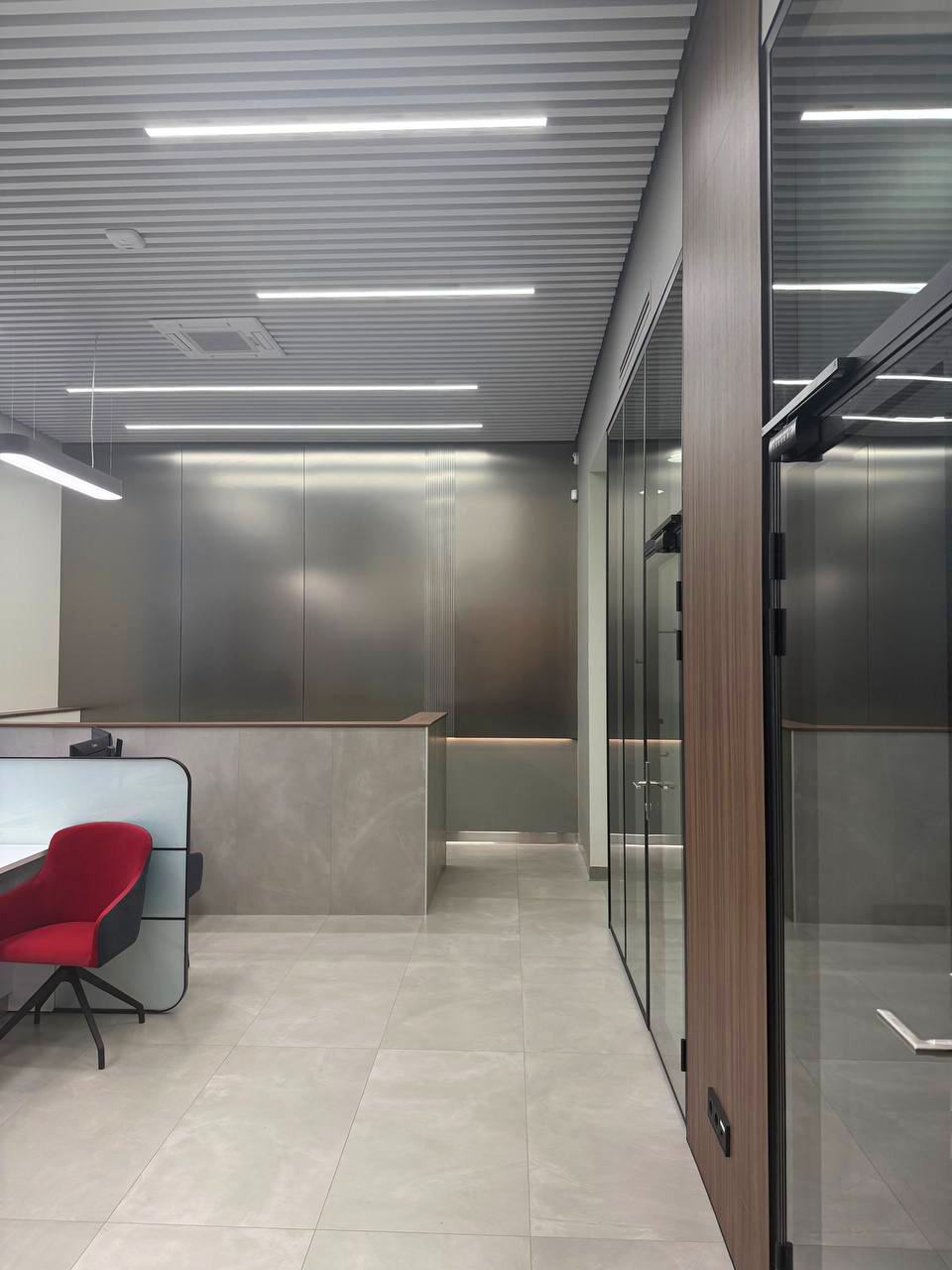 Офисный интерьер с акцентом на фактуры, свет и удобные рабочие зоны. Продумали зонирование, переговорные и маршруты сотрудников.